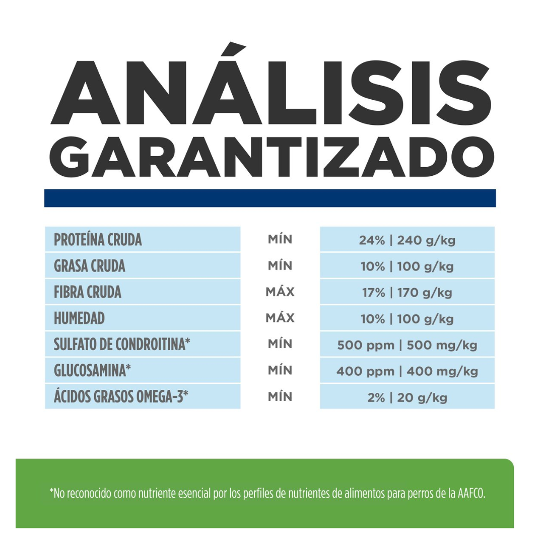 Proteína Cruda (min. ) 24% 240 g/kg Grasa Cruda (min.) 10% 100 g/kg Fibra Cruda (máx.) 17% 170 g/kg Humedad (máx.) 10% 100 g/kg Ácidos Grasos Omega 3* (min. ) 2% 20 g/kg Sulfato de Condroitina* (min. ) 500 ppm 500 mg/kg Glucosamina* (min. ) 400 ppm 400 mg/kg