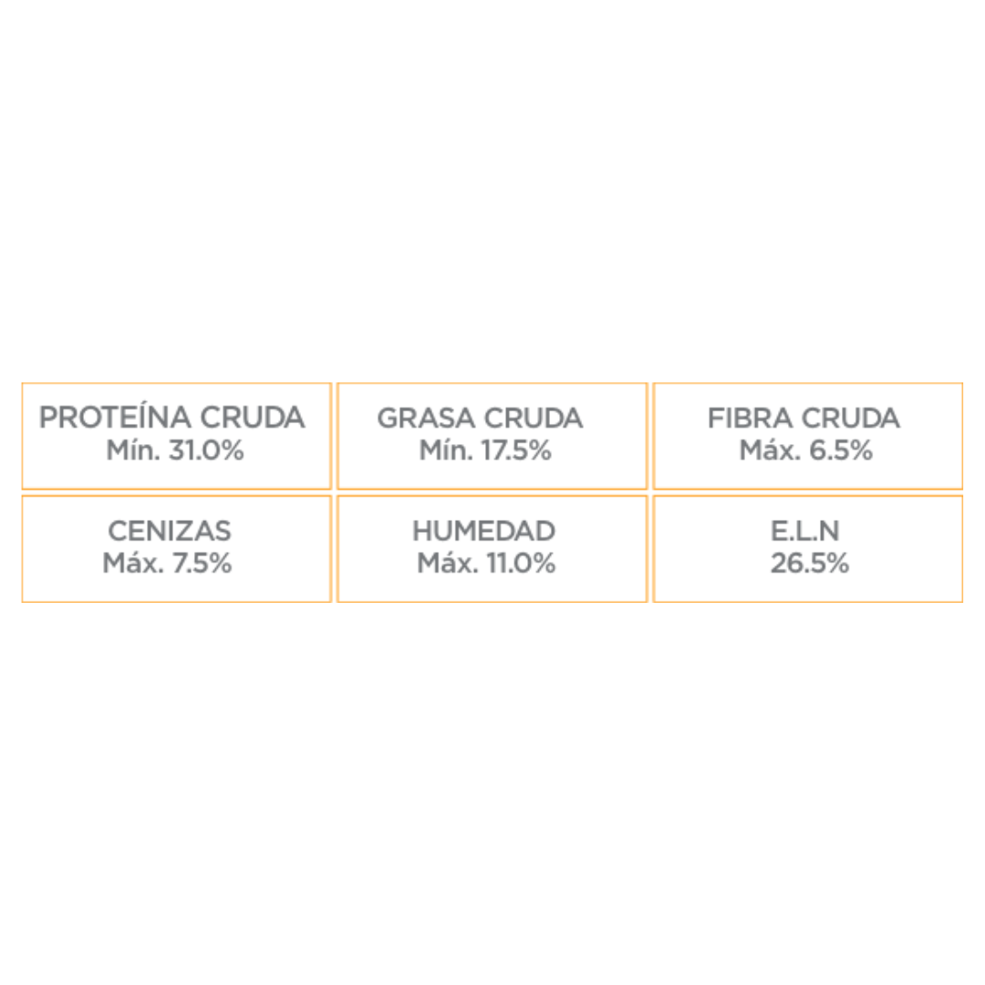 Proteina cruda min 31.0% Grasa cruda min 17.5% Fibra cruda max 6.5% Cenizas max 7.5% Humedad max 11.0% E.L.N. 26..5%