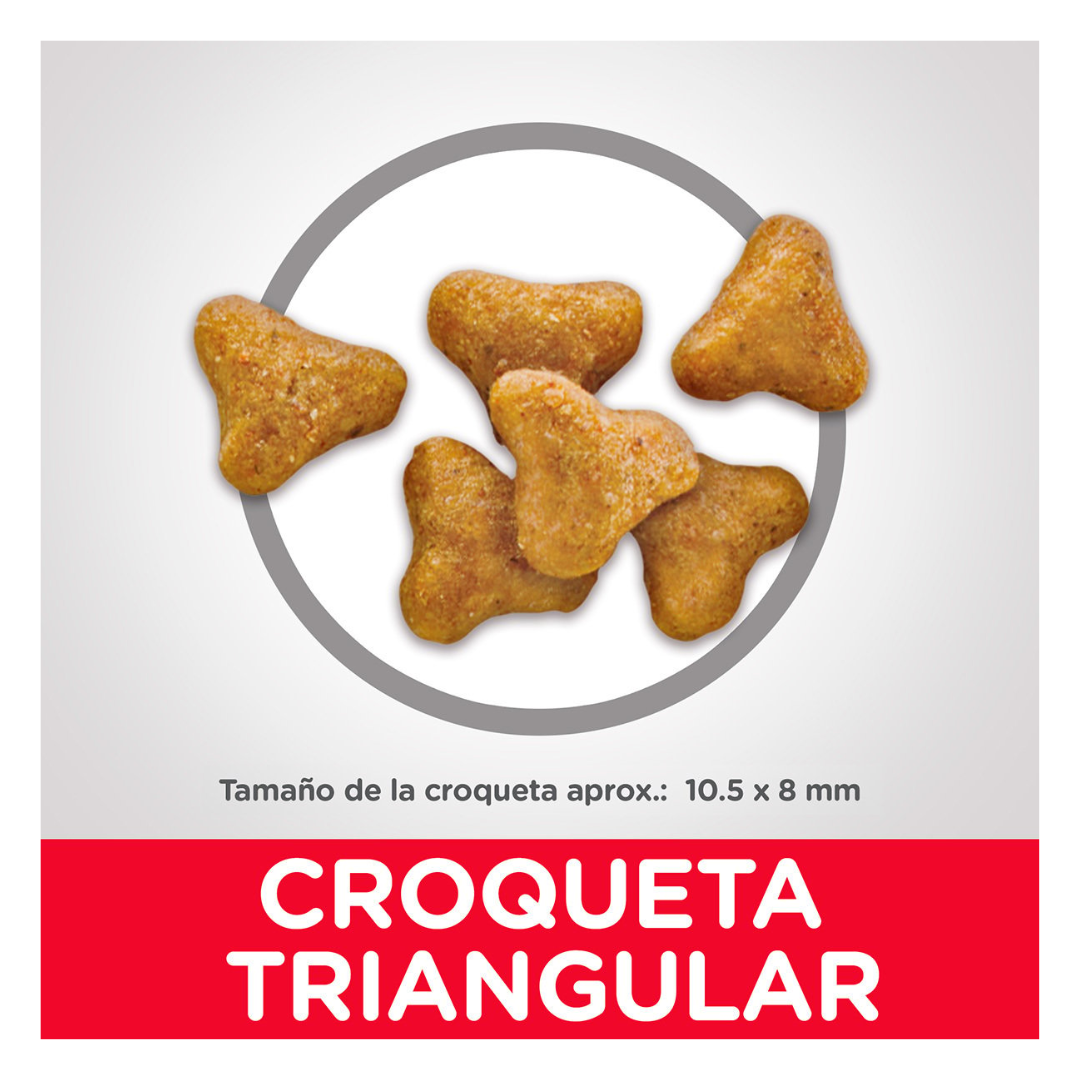 Pollo, arroz de cervecería, harina de gluten de maíz, celulosa en polvo, trigo entero, gluten de trigo, grasa de pollo, saborizante de hígado de pollo, pulpa de remolacha desecada, aceite de soya, ácido láctico, sulfato de calcio, cloruro de potasio, aceite de pescado, cloruro de colina, fosfato dicálcico, sal yodada, taurina, vitaminas (complemento de vitamina E, L-ascorbil-2-polifosfato (fuente de vitamina C), complemento de niacina, mononitrato de tiamina, complemento de vitamina A, pantotenato de calcio, complemento de riboflavina, biotina, complemento de vitamina B12, clorhidrato de piridoxina, ácido fólico, complemento de vitamina D3), minerales (sulfato ferroso, óxido de zinc, sulfato de cobre, óxido manganoso, yodato de calcio, selenito de sodio), L-carnitina, tocoferoles mixtos para la frescura, sabores naturales, beta caroteno.