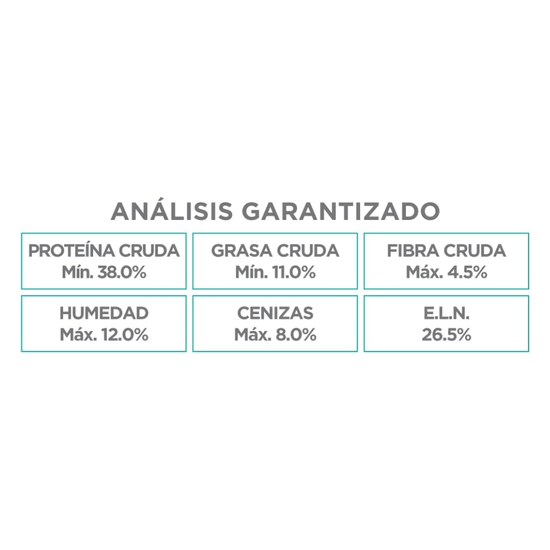 Proteina cruda min 38.0 % Grasa cruda min 11.0 % Fibra cruda max 4.5 % Humedad max 12.0% Cenizas max 8.0 % E.L.N. 26.5%